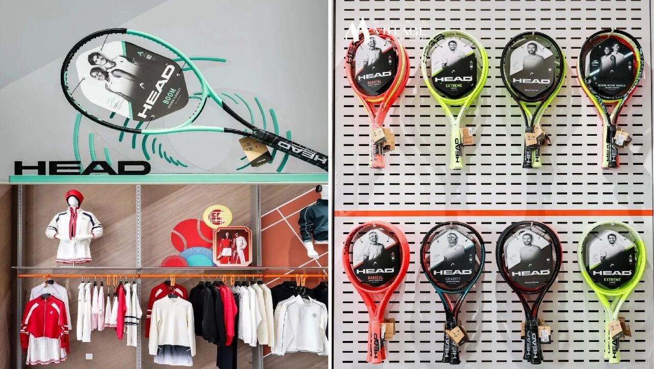 门头采用白色粗体HEAD无衬线LOGO+深灰哑光底板,对比强烈,远距离辨识度拉满,玻璃内侧印制品牌网球拍线条,强化运动专业属性。