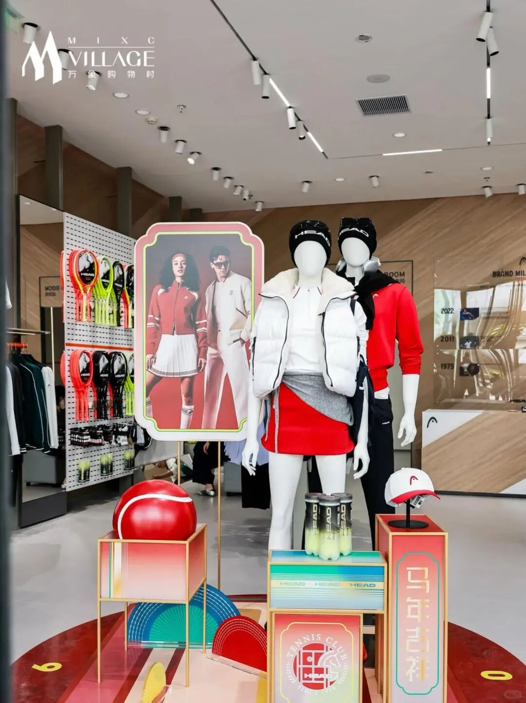 结合网球服饰、专业球拍、配饰、节日陈列的实拍,门店陈列区别于正价店,是“专业高端陈列标准+奥莱折扣货品逻辑”的结合体。