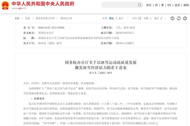 2024年,中央经济工作会议将冰雪经济写入提振消费的重点任务中。国务院办公厅印发的《关于以冰雪运动高质量发展激发冰雪经济活力的若干意见》,以加快构建现代冰雪产业体系为总体目标,从8个方面提出24条政策举措,为冰雪经济的高质量发展提供了更加优质的政策环境和更加有力的政策保障。